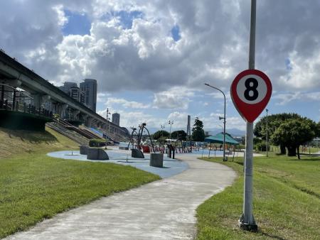正由於這裡很空曠遼闊,要找人或是找尋集合地點,沒有明確目標,總令人頭疼,於是乎二○二五年,在二重疏洪道堤頂,綠籬旁的通道或是階梯附近,也就是熊猴森遊樂園的上方,增設定位指標牌;用數字當定位,非常明確又好找,不管在堤頂散步,或是在堤坡玩遊戲,都能一眼瞧見,有了這樣貼心的標示牌,便能快速找到位置。