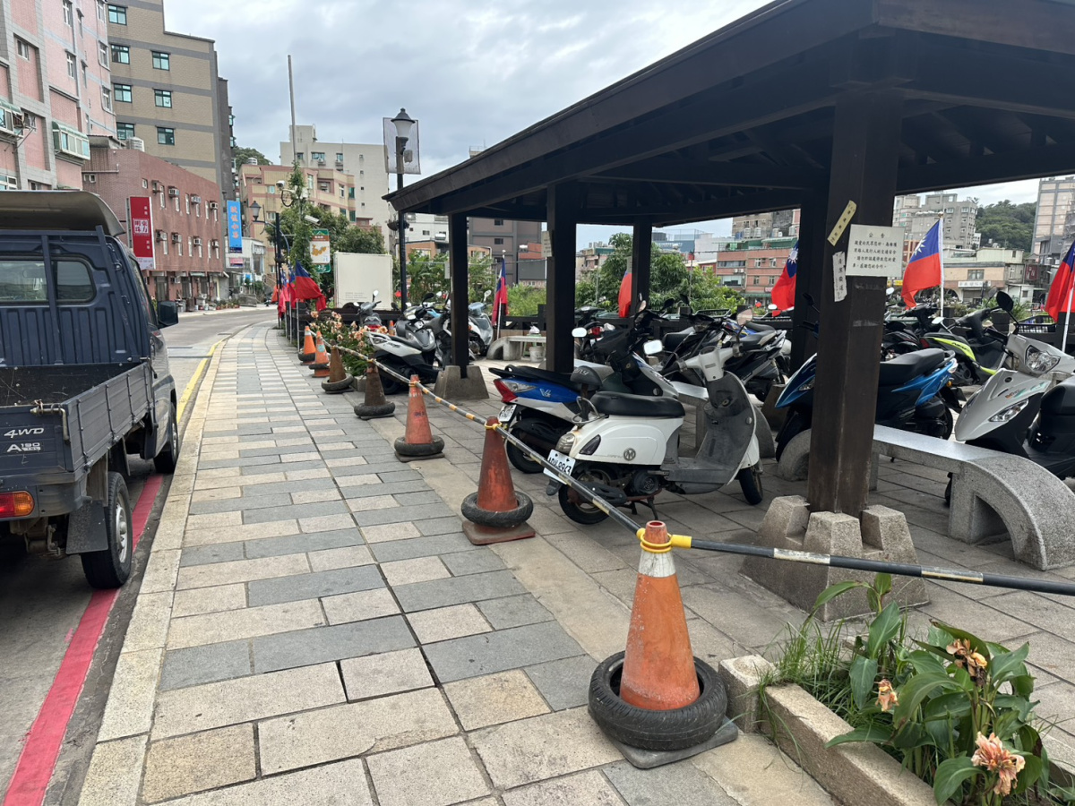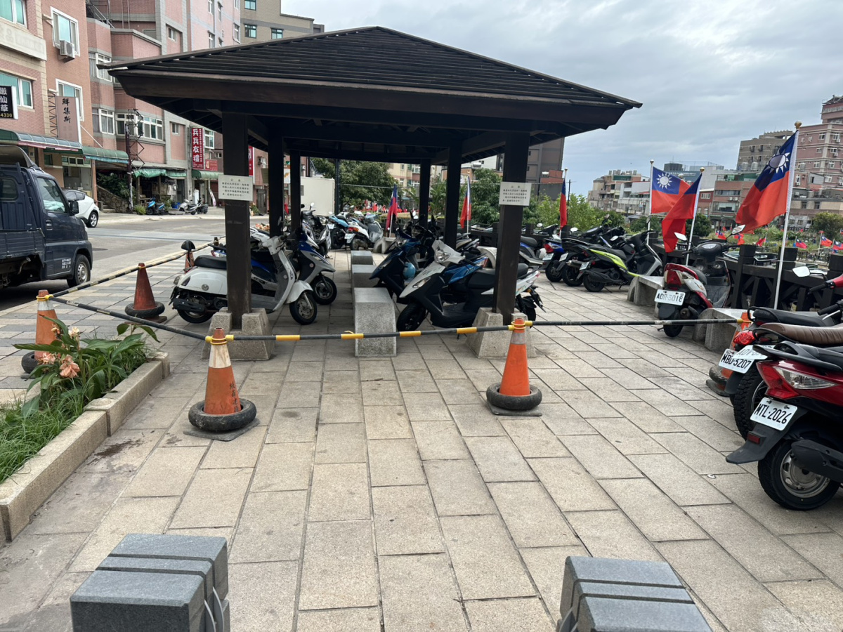 良健機車行前方涼亭工區已放置交通錐,請機動車輛勿停放涼亭區域內以免妨礙施工。