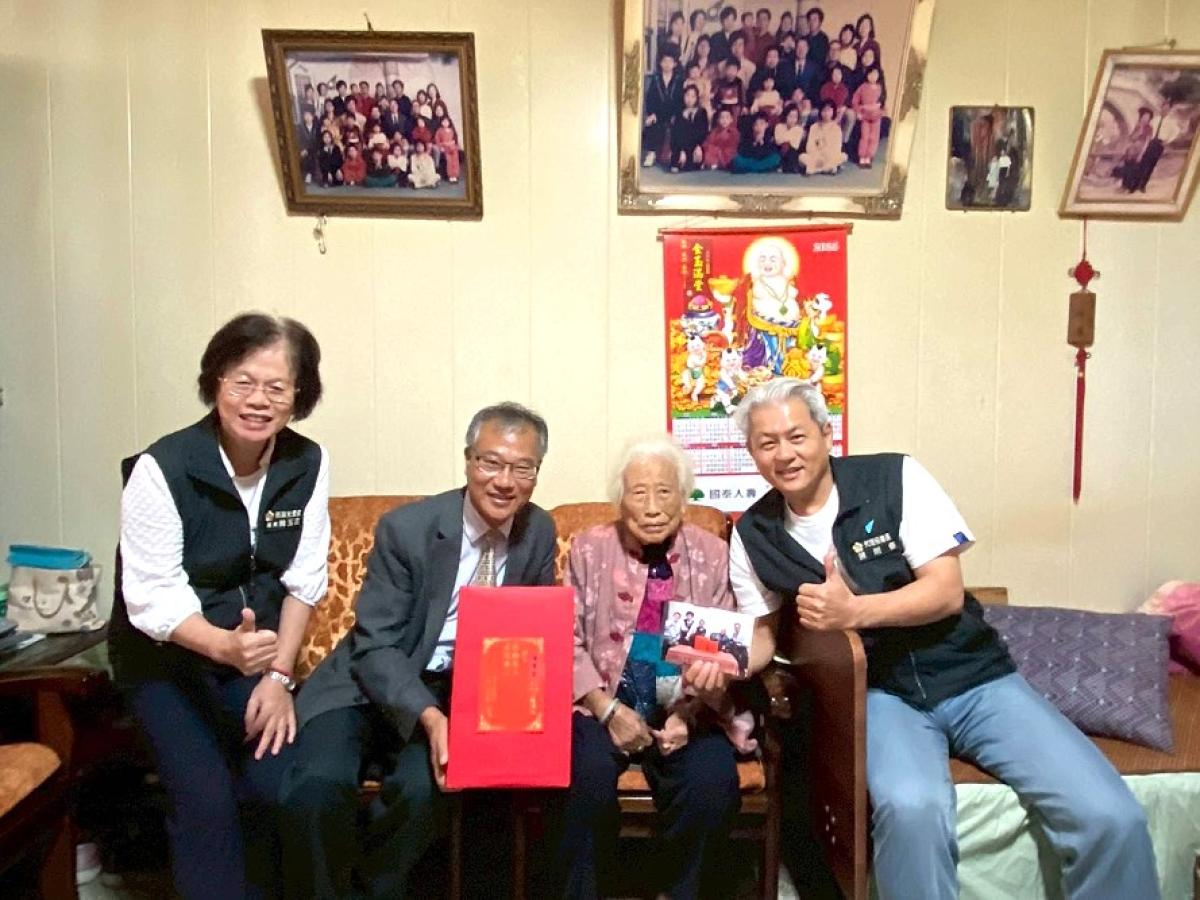 介壽村陳賽金女士91歲生日,代理秘書長陳明傑與鄉長林志東、民社處長曾玉花前往賀壽祝福。(圖:南竿鄉公所)