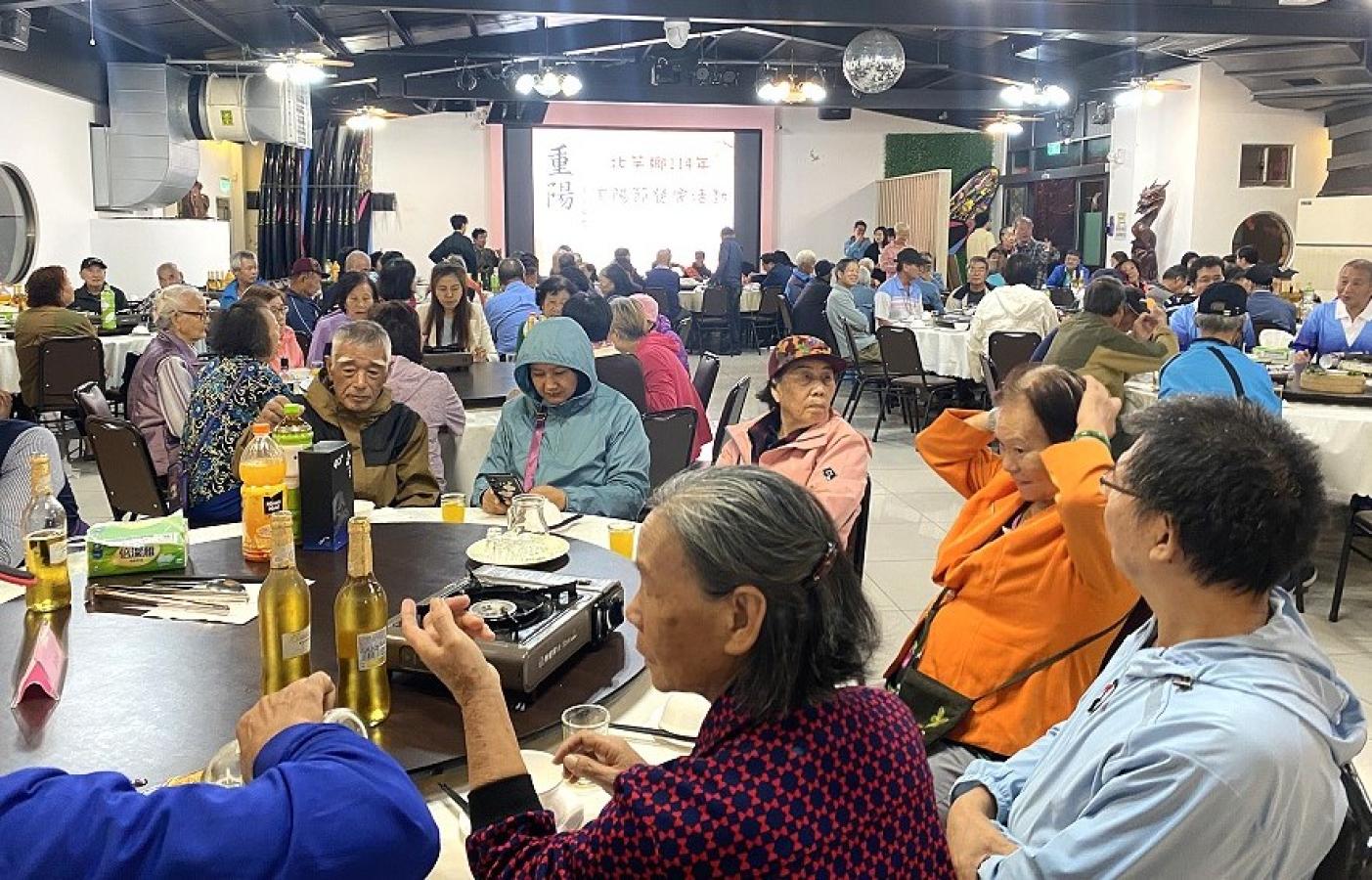 北竿鄉公所舉辦「114年重陽節模範老人暨敬老楷模表揚典禮」,現場貴賓與長輩齊聚共餐,氣氛溫馨熱鬧,洋溢著敬老愛老的佳節情誼。(圖/文:鄭禮頤)
