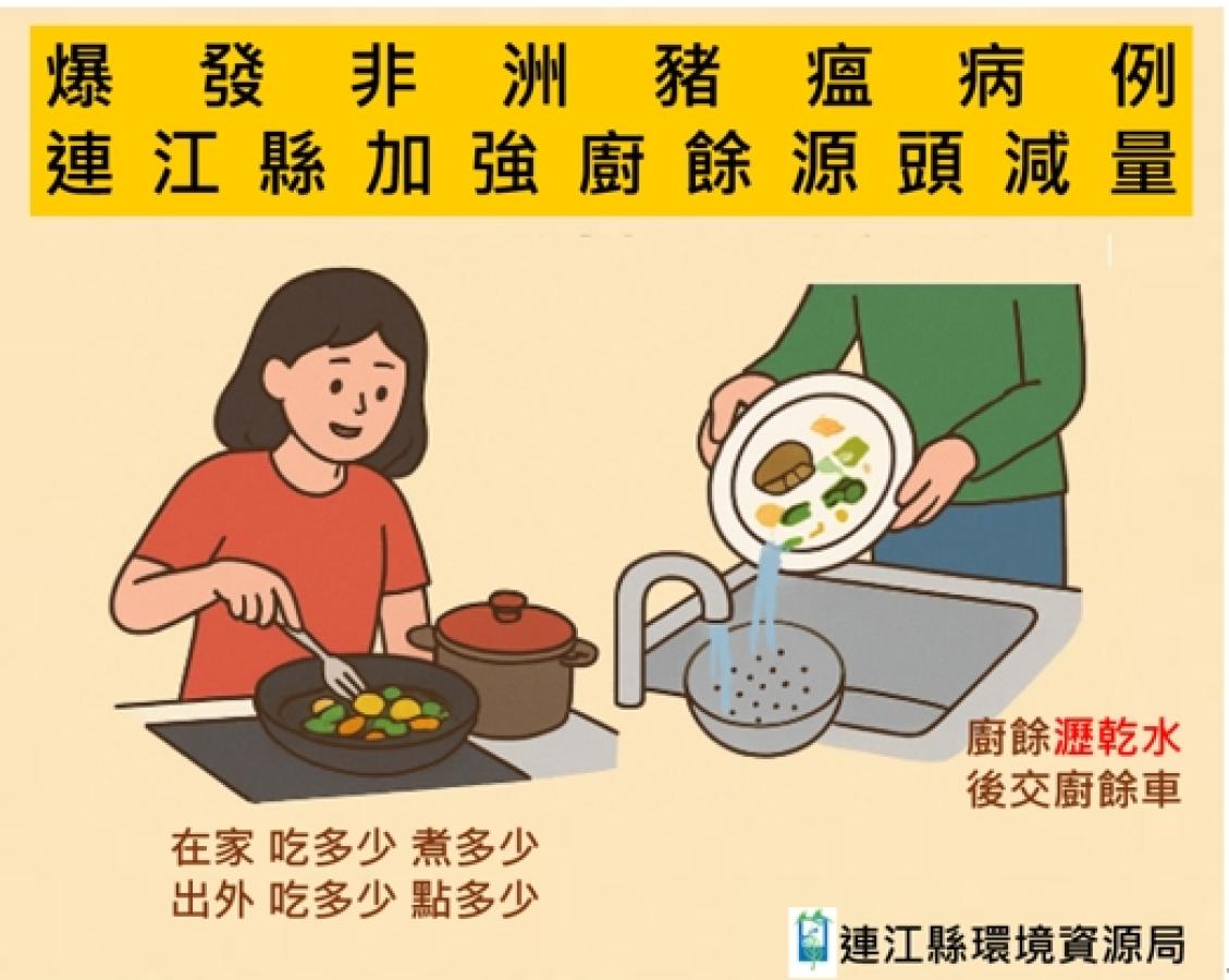 連江縣環境資源局表示,非洲豬瘟病毒具高度傳染力與長期存活特性,若含豬肉成分的廚餘遭不當回收或流入飼養端,將可能造成疫情擴散風險。為降低潛在危害,民眾應從日常生活落實「在家吃多少煮多少、出外吃多少點多少」,減少食物浪費,並有效減少廚餘產生。