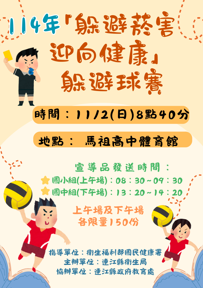 八、本活動分為國小組(上午場)及國中組(下午場),為希望各位鄉親能到場幫參賽隊伍選手加油,若全程到場加油之民眾可兌換宣導品1份,宣導品兌換劵於體育館入口處發放,數量有限。