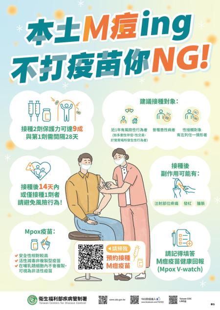 接種疫苗是預防M痘最有效的方式,建議符合接種條件的民眾應盡速完成2劑疫苗接種: