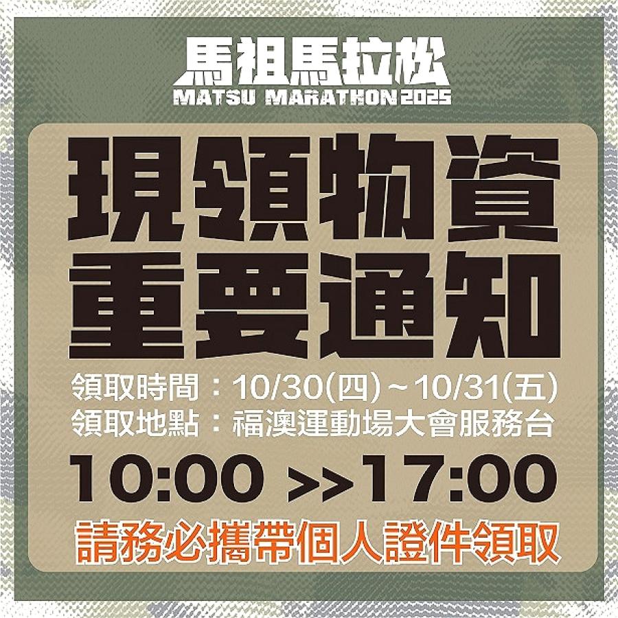 【本報訊】2025第十屆馬祖馬拉松11月1日登場,請跑者們在今(30)日、明(31)日兩天前往福澳運動場大會服務台領取跑者物資。領取時出示個人身分證明文件,親人代領亦同。