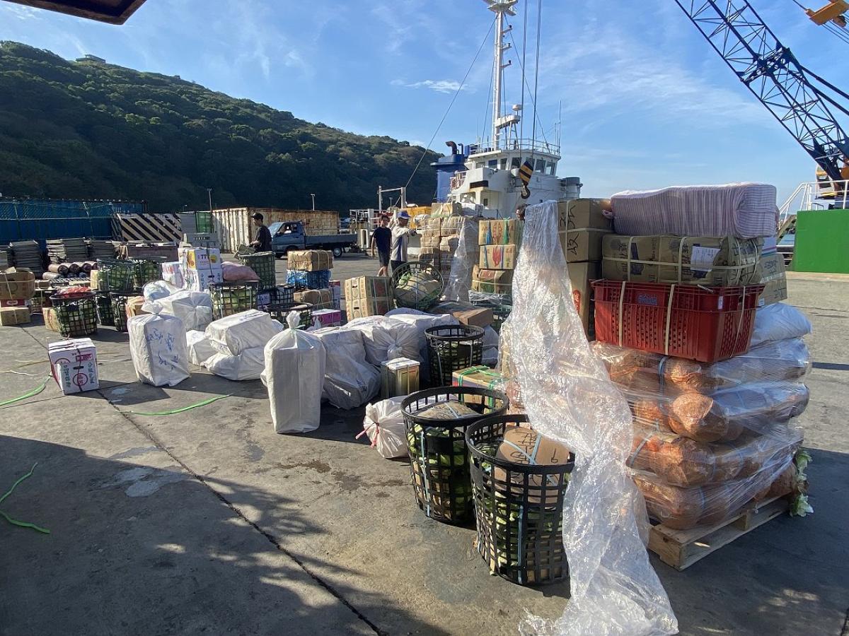 滿載生活與商用物資的貨船清晨抵達北竿白沙港,碼頭堆滿各類補給品,為離島帶來久違的補給景象。(圖/文:鄭禮頤)