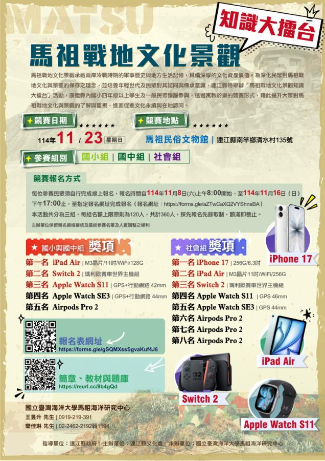 「馬祖戰地文化景觀知識大擂台」這項活動由連江縣政府指導、文化處主辦,國立臺灣海洋大學馬祖海洋研究中心承辦。11月23日(星期日)舉行,競賽地點設於馬祖民俗文物館(南竿鄉清水村135號),分為國小組、國中組及社會組三組進行,採初賽(Kahoot!線上答題)及決賽(現場舉牌PK賽)兩階段方式辦理,各組並於賽後舉行頒獎典禮。