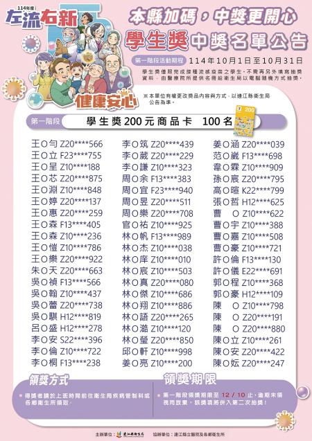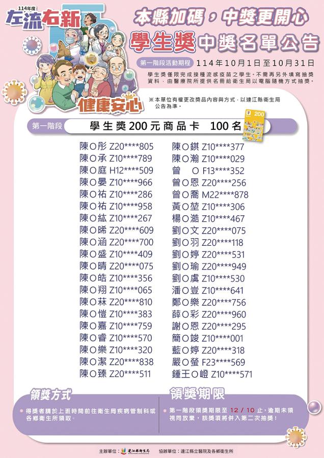 【本報訊】衛生局「左流右新,健康安心,中獎更開心」抽獎活動,首波電腦隨機抽獎得主出爐!符合左流右新抽獎資格民眾共391人、流感學生獎資格共865人;分別抽出59個左流右新獎項及100個學生獎,請詳見附圖中獎名單。衛生局表示,12月底前完成流感疫苗+新冠疫苗接種,還可參加第二階段抽獎,歡迎民眾踴躍接種,提升保護力。