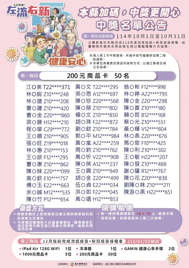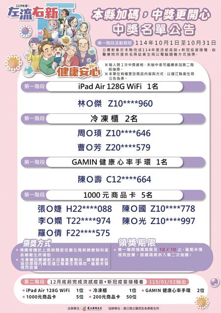 為提升民眾接種意願,連江縣衛生局今年特別企劃「左流右新,健康安心」抽獎活動,12月31日前於本縣完成114年度流感疫苗+新冠疫苗接種(包含門診接種或校園、機構集中接種),不需再另外填寫抽獎資料,將由醫療院所提供名冊給衛生局以電腦隨機方式抽獎;因學生僅接種流感疫苗,故學生獎僅限完成接種流感疫苗之學生。(相關活動資訊請參考連江縣衛生局官網:https://reurl.cc/DOkxXQ)