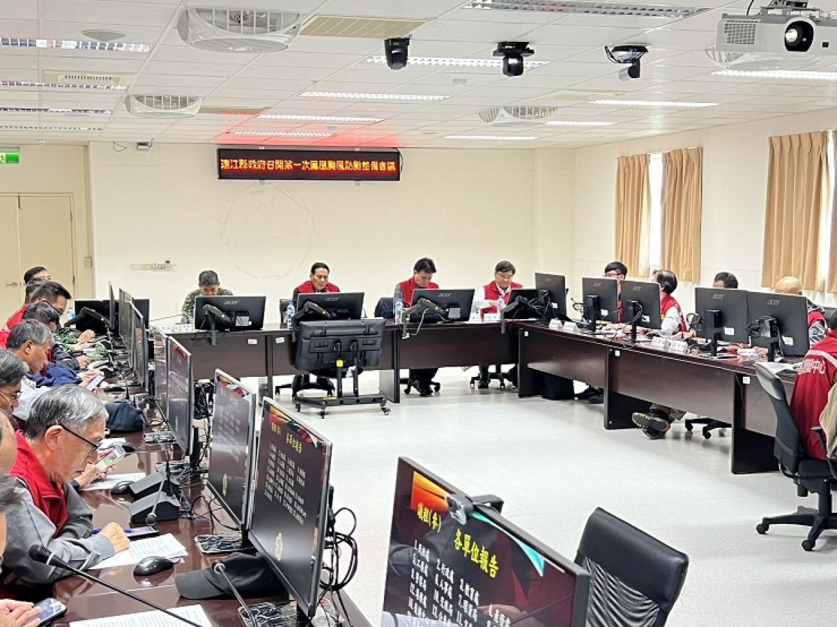 連江縣災害應變中心今天下午召開防颱會議,縣長王忠銘主持,副縣長陳冠人、馬防部、馬管處及縣府所屬機關單位均出席會議,針對防颱整備進行說明,各單位加強景點、工地、路況等颱風應變;海岸巡、警察加強岸際巡邏。