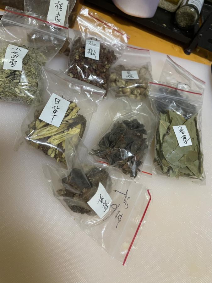 八角一顆、香葉一片、桂皮一小段、花椒與小茴香各一小撮、丁香兩根、荳蔻一顆、甘草一片,使用得仔細。滷湯慢慢翻滾時,空氣裡散開的味道,像是在低聲吟唱什麼古老的咒語。