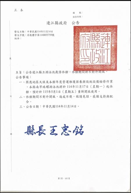 一、因應地區天候及本館年度營運維護保養與設施設備檢修作業,本縣南竿珠螺游泳池將於114年11月17日(星期一)起休館,預計於115年5月1日(星期五)重新開放使用。