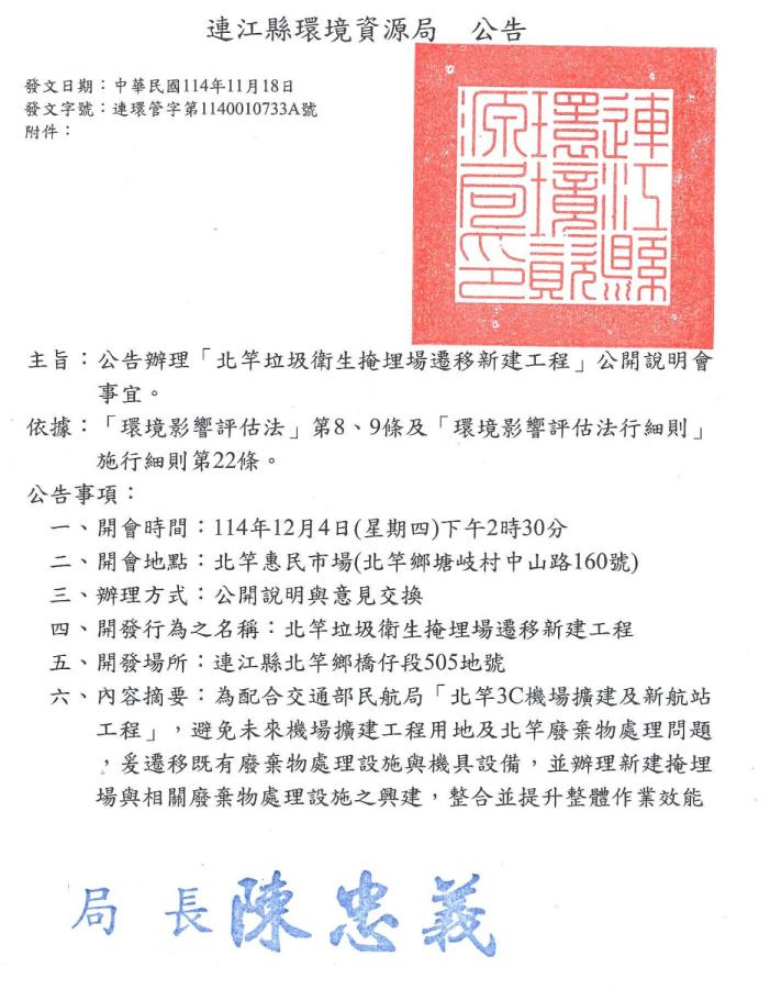 環資局公告/北竿垃圾衛生掩埋場遷移新建工程公開說明會