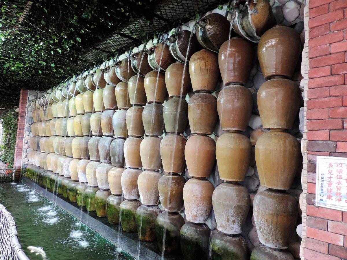 宜蘭酒廠的酒甕瀑布生動有趣:宜蘭有一座百年酒廠,走進酒廠處處充滿酒的裝置藝術,園區設有典藏多元而豐富的「甲子蘭酒文物館」,除展售酒廠生產酒品外,並以生動活潑內容介紹酒的歷史文化及琳瑯滿目的相關物品,最醒目的是,館外有一整排甕牆,由百餘個酒甕建構而成,最上層一排的酒甕,還會源源不絕的流出水來,猶如一座小型瀑布,營造出「遇水則發」的吉祥意涵;貼心的是,甕牆旁還設置有酒甕洗手台,由酒甕妝點而成的設施,高度不一,方便小朋友洗手,尤其親子洗手台常帶來溫馨的畫面,酒甕洗手台的整體設計,頗能符合眾人的需求。另外,園區設有「酒銀行」提供儲存酒的服務,走入儲存美酒的酒窖區,成排的酒甕,標註有酒品名稱、儲酒主人姓名、儲存日期等,在適宜的溫度與濕度下,讓人感受到酒越陳越香的情境;儲存在酒銀行的陳年好酒,不論是自用或與朋友分享,都融合著諸多美麗的期待。