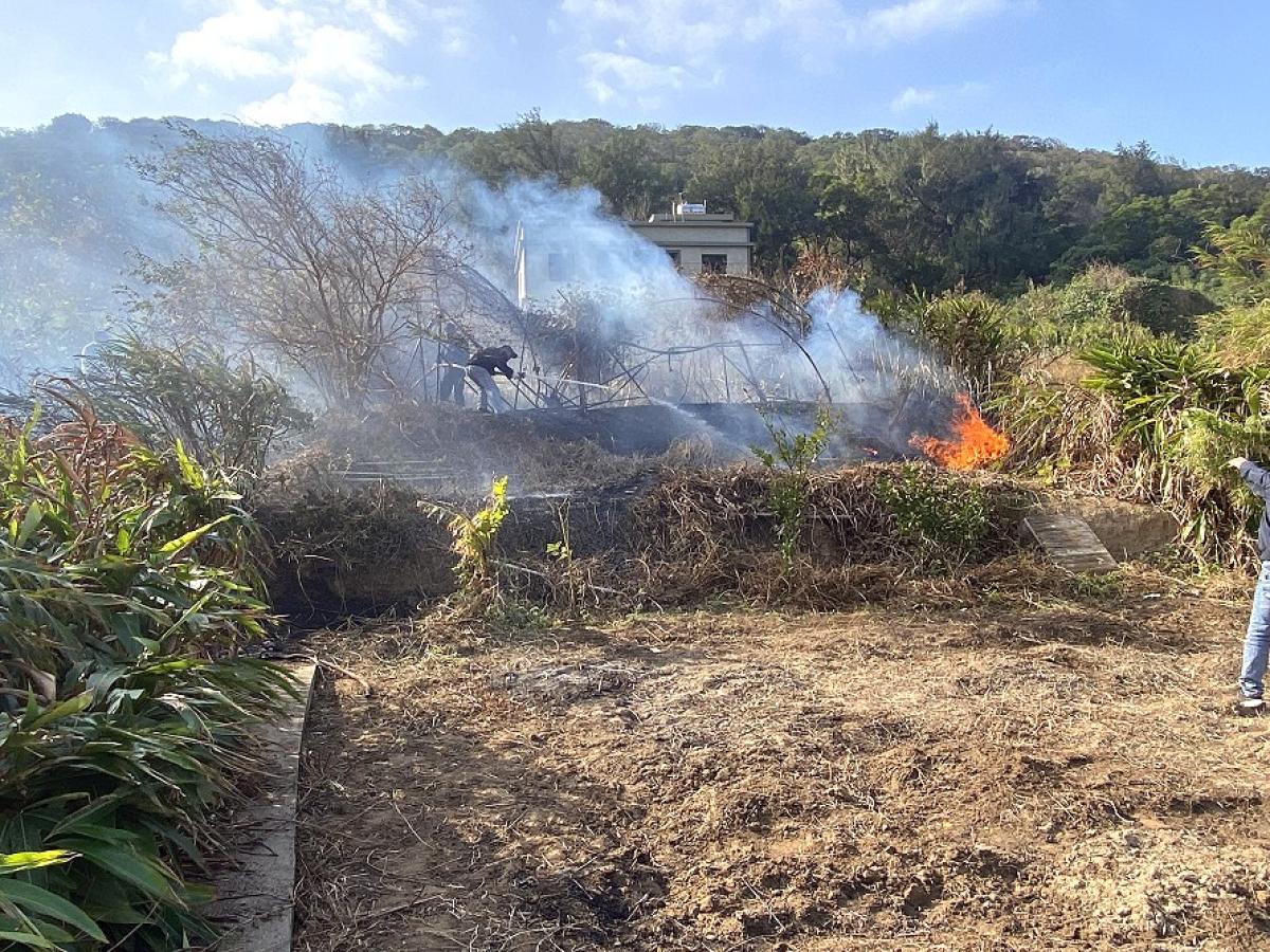 雜草起火冒煙,消防人員與義消、村民到場即時灌救,火勢迅速受控。(圖/文:鄭禮頤)