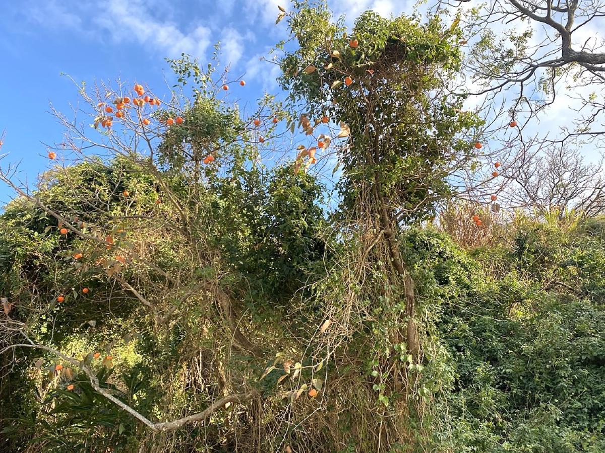 順著步道繼續往龍角峰五位靈公廟方向前進的道路上又出現另一處冬季限定的小風景,一棵野生柿子樹在落葉後果實更顯鮮明,橘紅色的柿子高掛枝頭,在冬季陽光下宛如一串串小燈籠亮在山谷之間,與前段豆梨花的清亮綻放形成一前一後的自然雙景。這段山路也因花開與果熟在同一季節登場,意外展現出芹壁冬日特有的細膩層次。