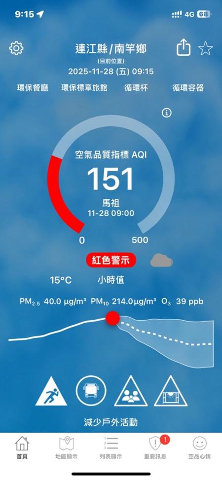 【本報訊】連江縣28日上午9時觀測空氣品質AQI為151,指標污染物為PM10,已達中級預警,空污應變組織依法成立地方防制指揮中心 。請各單位針對指標污染物進行應變措施,提醒鄉親,目前空氣品質對所有族群不健康,請縣民減少戶外活動,保護自身安全。