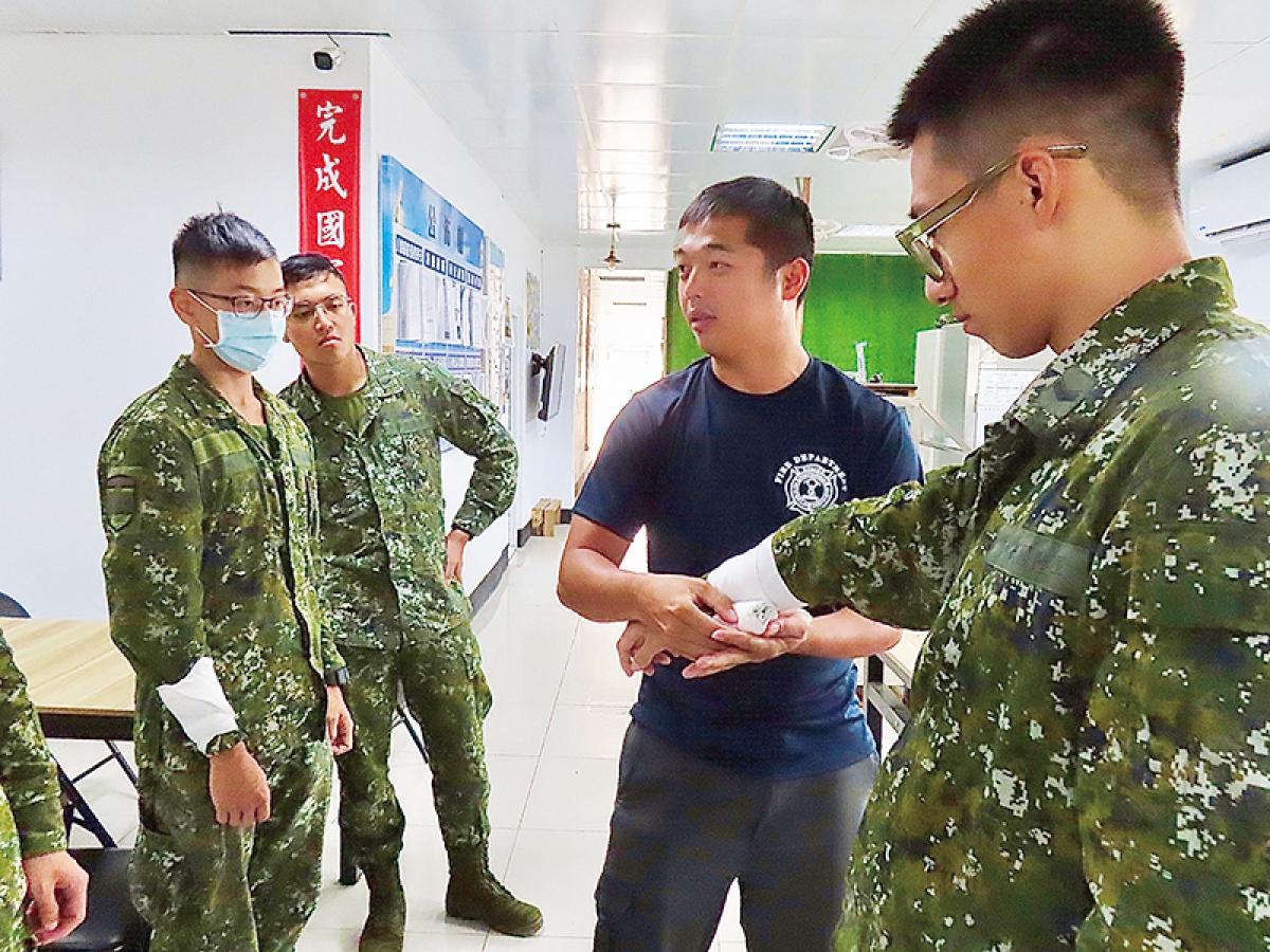 【特約記者林哲良/北竿報導】為強化官兵災害防治及自救互救能力,步兵營日前邀請連江縣消防局消防員擔任授課教官,課程中以模擬地震、火災等情境,使官兵學習逃生姿勢、滅火器使用、止血、包紮及心肺復甦術等災防技能,此課程不僅習得基礎專長,爾後面對他人受傷、受困,能即時應處、予以急救。