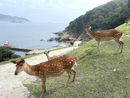島上的路蜿蜒向高處延伸,遠處是蔚藍的海,近處是漫山的綠。我們邊走邊看,有時會遇見鹿從小徑另一端走來,與我們四目相對,然後安靜地擦肩而過。