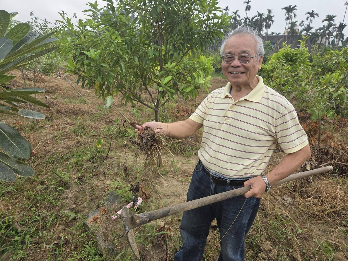 小堂趕忙帶我們前去芋頭區,只見一大片果園,底下剛除草還很多雜亂的土堆,冒出一些小不點葉子的芋頭,此時小堂拿著鋤頭予阿護說:「你來挖,果樹下有上百株的芋頭,等著你來挖。」就這樣阿護拿著鋤頭來回揮動,挖起芋株下主體大顆芋頭外,下面竟附著有七、八個小芋頭,就這樣他挖了近十處,取出十顆大芋頭,供我們將土剝下,且將附著在一旁的小芋頭一一摘下,總共近百顆的小芋頭,可樂壞我們,未來幾週我們不愁沒有芋頭可吃,當下我還盤算著中午回去就煮個芋頭米粉湯,配合著蝦子、花枝,就可是一鍋餐廳的名菜,想著口水都要流下來了。