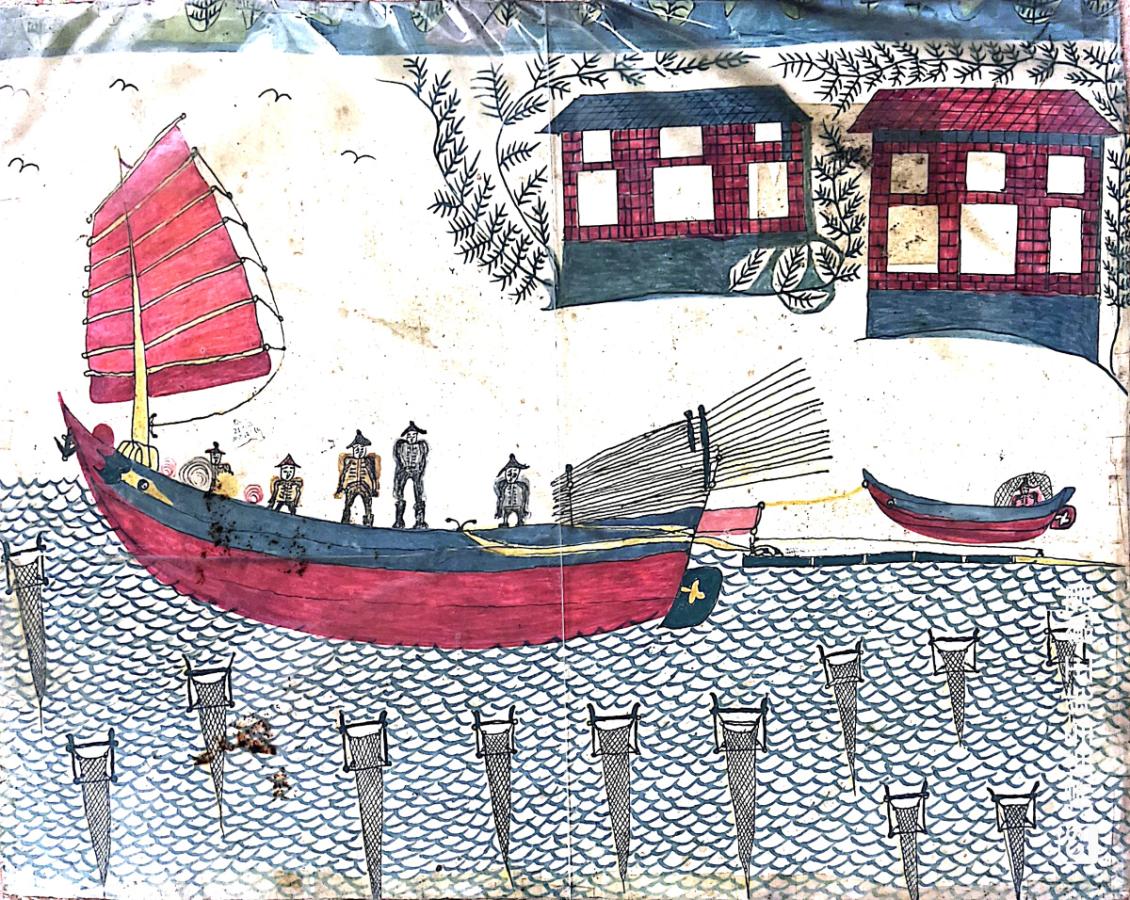 馬祖女兒、臺師大圖文傳播學系教授曹筱玥VR新作《海之彼岸》榮獲美國洛杉磯電影獎(LAFA)最佳虛擬實境獎;下圖為素人藝術家曹常泰所繪製的拍楸。(圖:曹筱玥提供)
