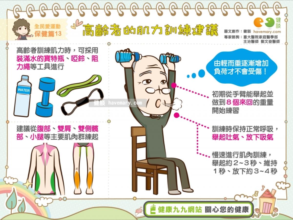 2、阻力(肌力)訓練(每週 2–3次):重點訓練大肌群(腿、臀、背、胸、肩)。對長者來說,可採以下簡易且安全的動作,每個動作做 8–15次為一組,做1–3組,感到最後幾次吃力即可。動作範例: