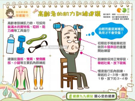 2、阻力(肌力)訓練(每週 2–3次):重點訓練大肌群(腿、臀、背、胸、肩)。對長者來說,可採以下簡易且安全的動作,每個動作做 8–15次為一組,做1–3組,感到最後幾次吃力即可。動作範例: