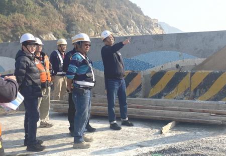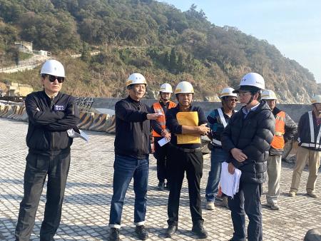 最後視察的大坵島聯外道路工程,現場聽取承辦單位及施工團隊說明,由於通往橋仔村的路段包含橋梁與坡地等地形條件,施工較具挑戰,相關單位正依現況調整工法以確保進度。