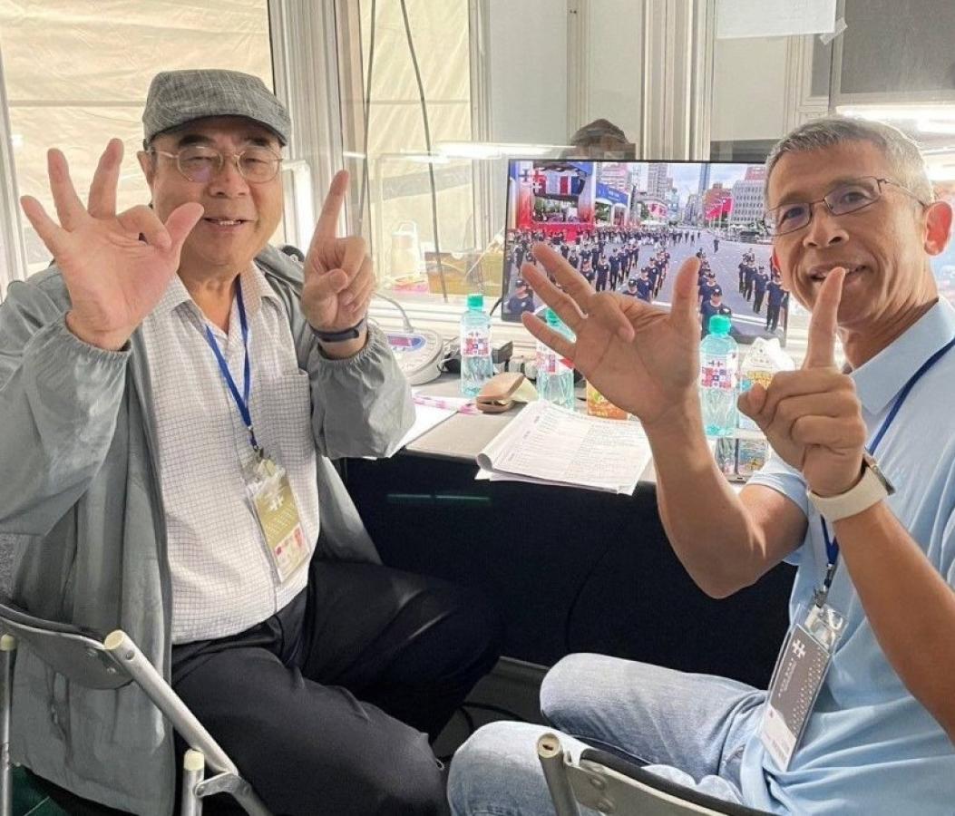 圖為陳高志老師(左)113年國慶大會閩東語直播口譯人員。(圖:李翠雲)