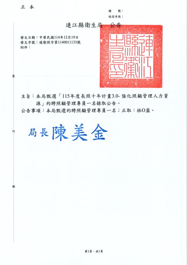 連江縣衛生局甄選「115年度長照十年計畫3.0- 強化照顧管理人力資源」約聘照顧管理專員一名錄取公告。