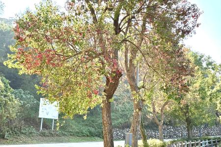 南竿機場道路旁烏桕樹葉色轉紅,在陽光照耀下更顯晶透亮麗,為冬日道路增添繽紛景致。(圖︰讀者提供)