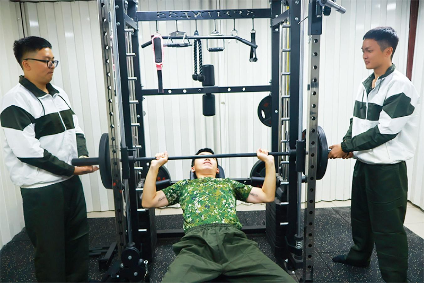 官兵實施槓鈴臥推。