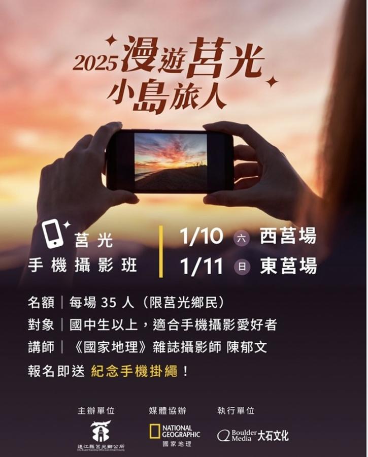 【記者宋幸儒報導】莒光鄉親限定!「2025漫遊莒光 小島旅人」由莒光鄉公所攜手《國家地理》雜誌,共同推出系列活動「莒光手機攝影班」,2026年1月10、11日邀請莒光鄉親一起用手機紀錄家鄉之美,每場限定35人,即日起開始報名。