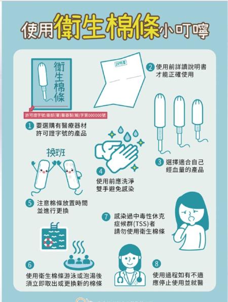 3、使用前要清潔雙手,並記得按時更換:使用前應澈底清潔雙手,一次只需置入一條。建議每4至8小時更換一次,勿超過8小時。棉條放置完成後,會留有一條棉線在體外,以方便取出。若放置在正確位置應不會有異物感;使用過程如有不適,應立即停止使用並請教醫師。另於使用衛生棉條游泳或泡湯後,須立即取出或更換新的棉條。