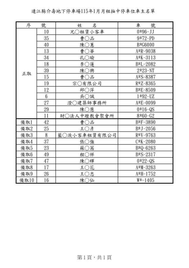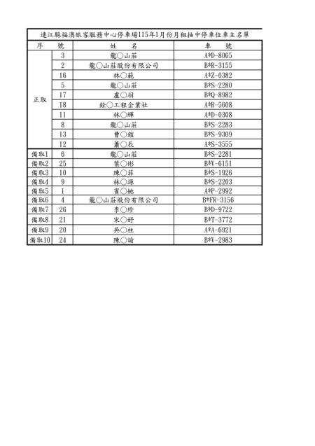 繳費:12月25日-29日上午08:30至晚間18:00介壽地下停車場管理室繳費,逾期將由抽中候補車主依序候補。