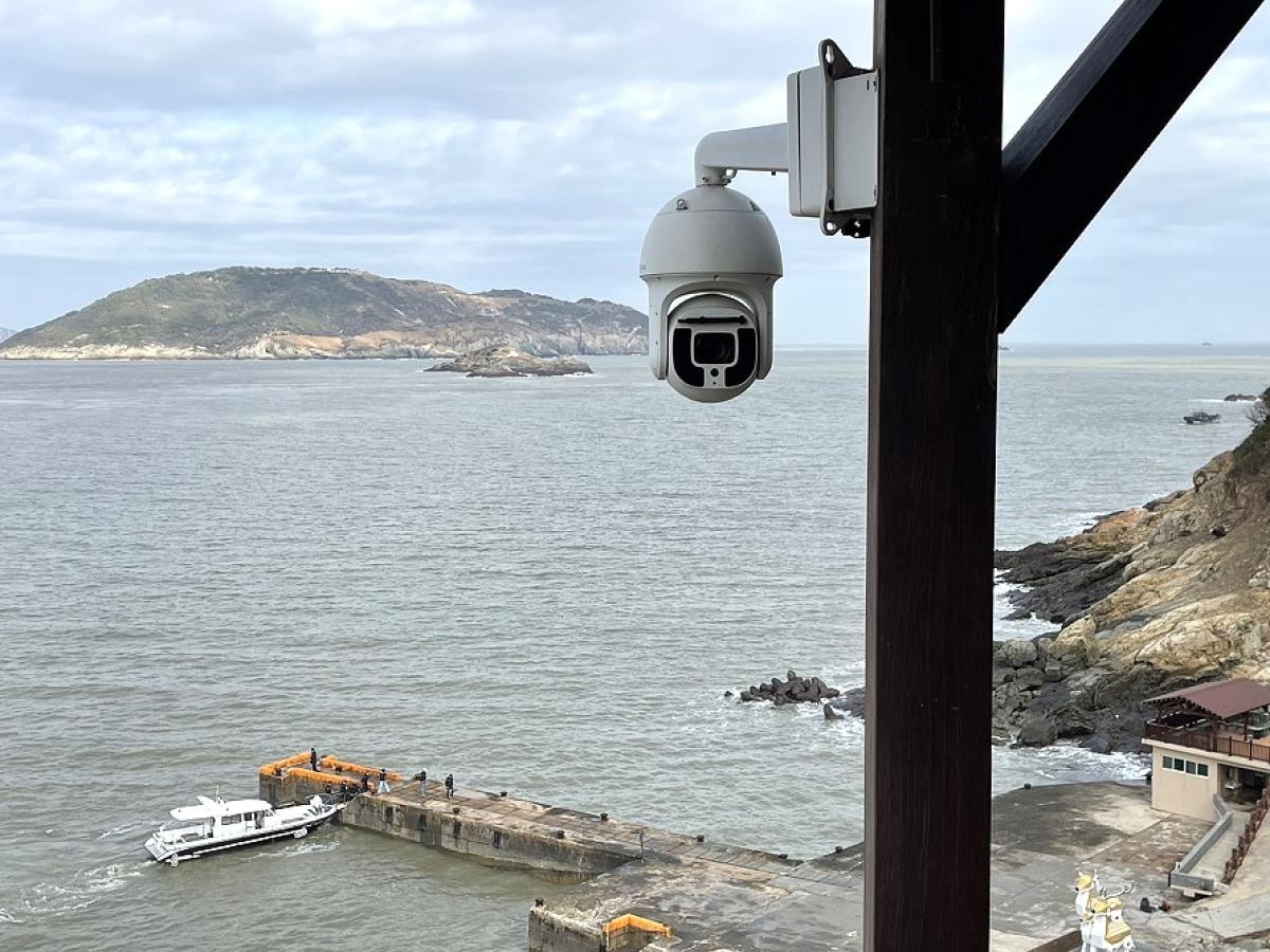 連江縣政府產發處於大坵島碼頭架設24小時監視系統,即時掌握遊客上下船及與梅花鹿互動狀況,強化安全管理。(圖/文:鄭禮頤)