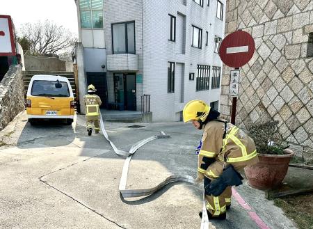 為提升高樓層建築物災害搶救效率,東莒分隊在東莒大坪找茶民宿進行高樓層建築物搶救演練,透過實際操作熟悉建築物結構與救災動線。(圖/文:蔡夢玲)