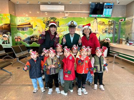 叮叮噹!聖誕佳節來臨,介壽附幼可愛的小朋友們穿上聖誕服飾,分組前往鄉公所、郵局、警局、機場等地報佳音。孩子們載歌載舞,投入自信表演,為各機關與民眾送上溫暖祝福,現場充滿歡樂聖誕氣息。