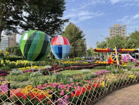 在堆疊韻致的菊藝花海中,原本已經讓所有人目不轉睛,沒想到在這裡,還安置彩麗多趣的熱氣球和飛機呢;使得人們在綻放的花海中,透過遐想,得以搭乘熱氣球和飛機,在冉冉上升的美麗情懷之中,得以讓夢想啟程,也能欣見奇幻而綺麗的世界。