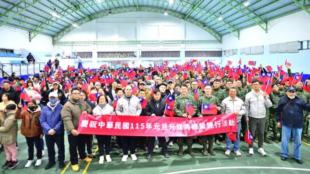 考量天氣寒冷、東北季風強勁,為確保參與軍民安全與活動順利進行,今年元旦升旗典禮首度由戶外移至體育館舉行。活動在國軍氣勢磅礡的戰鼓表演中揭開序幕,鏗鏘有力的鼓聲震撼全場,展現軍民同心、守望家園的堅定精神;隨後由婦女會帶領暖身健康操,現場軍民熱情參與,為後續健行活動暖身,也讓寒冷的清晨洋溢熱絡與歡樂氣氛。