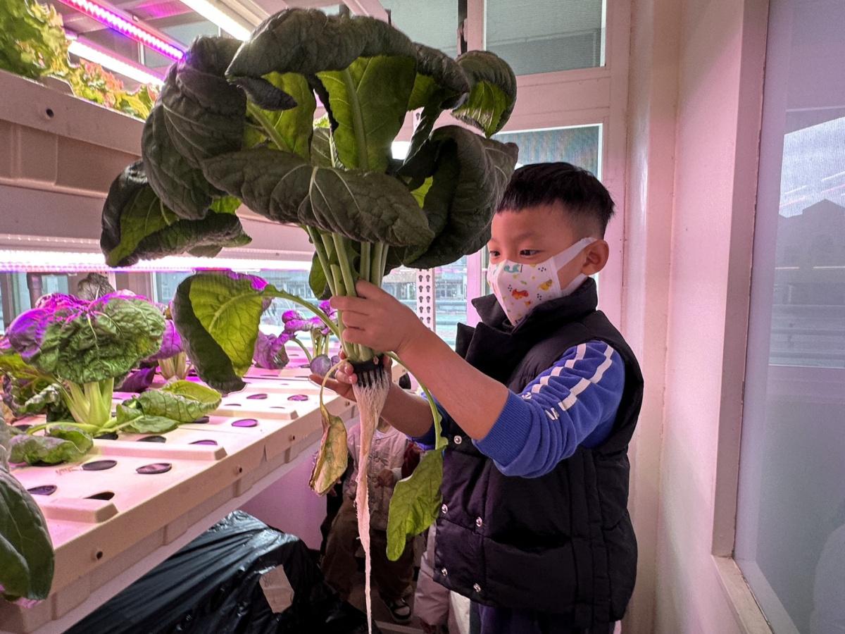 本次的「紅達豐小松菜」與「羅莎捲葉萵苣」來自職探中心的「科技小農夫職業體驗課程」。學生們在課程中運用智慧農業系統,精準掌握了蔬菜生長環境,特別為大同之家的長輩們種植了一批無毒、健康的優質蔬菜。並由介壽幼兒園的小朋友親自採摘,並成為本日最萌送貨員,為大同之家的長輩們送上最稚嫩的笑容與蔬菜。