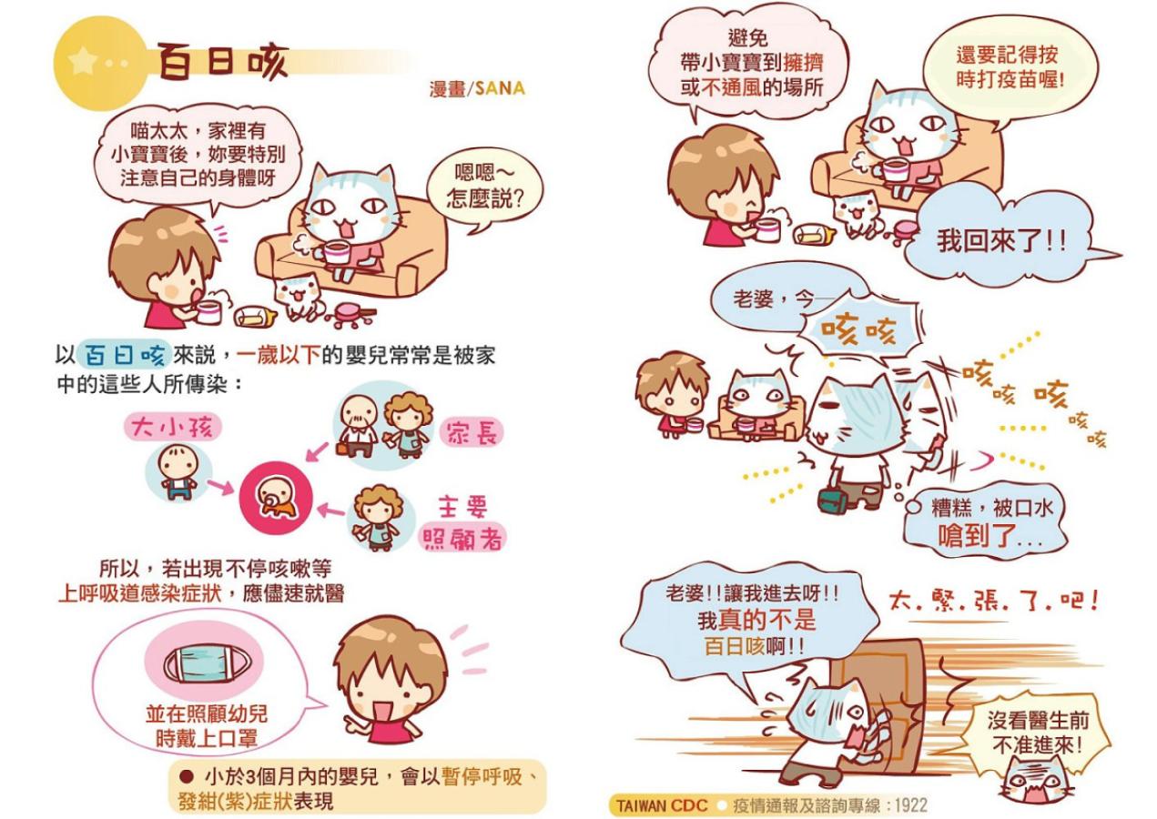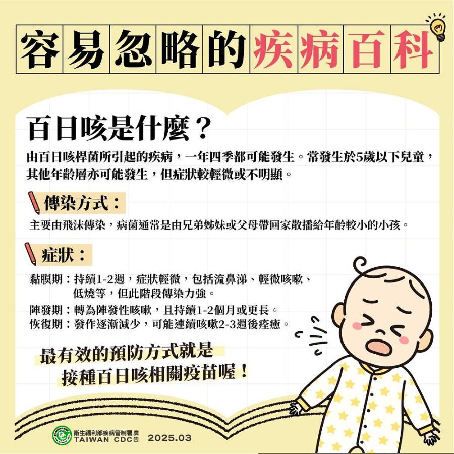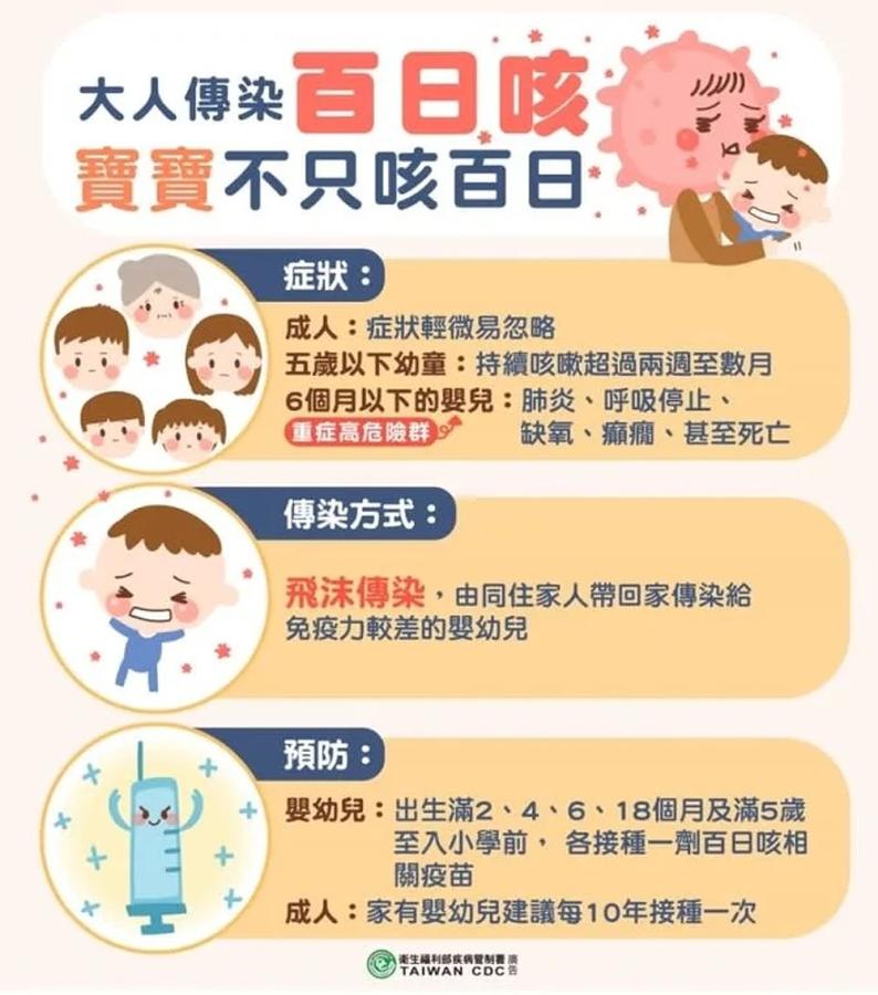 若家中嬰幼兒若出現陣發性嚴重咳嗽、呼吸有哮喘聲、咳嗽後臉潮紅或發紫及咳嗽後嘔吐等症狀,請儘速就醫。