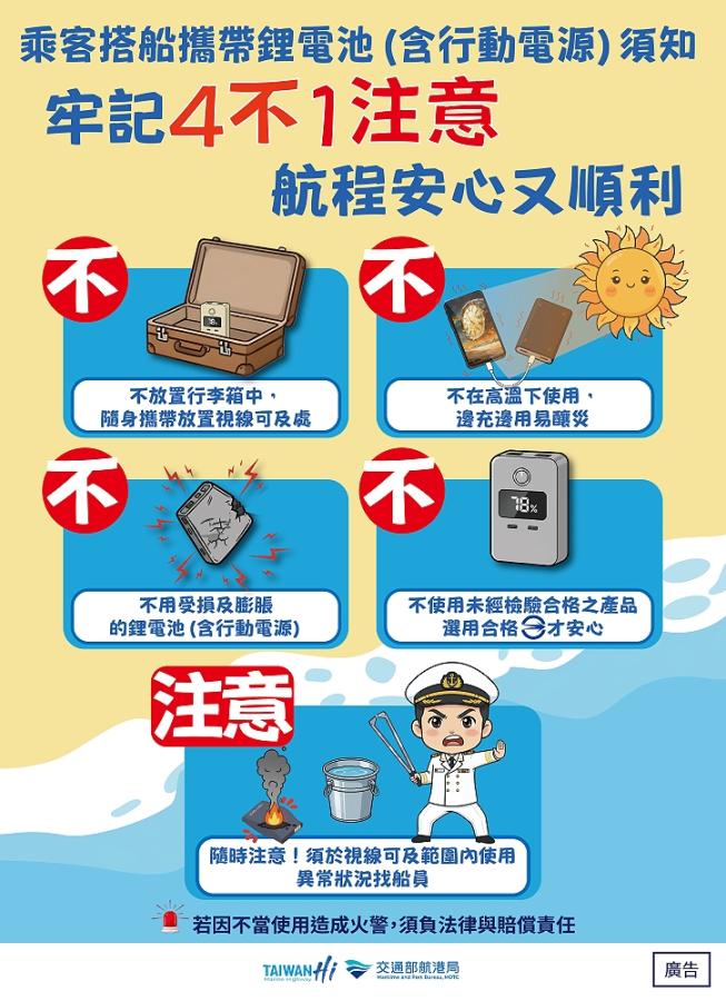 為確保民眾攜帶行動電源登船的航行安全,交通部航港局特別提醒民眾遵守「4不1注意」原則,共同維護海上航行安全。(圖:交通部航港局)