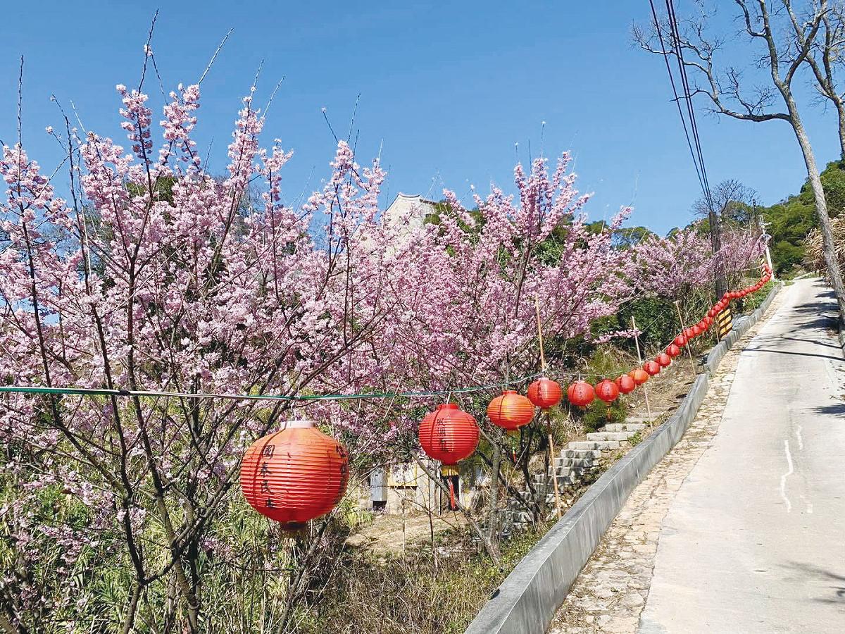 橋仔懷恩道場前方道路與芹壁龍角峰一帶,為北竿春季具代表性的賞櫻景點。(圖:讀者提供/文:鄭禮頤)