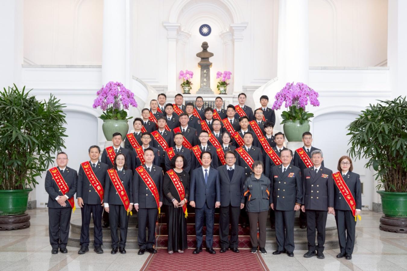 【本報訊】連江縣榮獲114年鳳凰獎的「消防楷模」曹育翔(上圖第六排左2)、「義消楷模」馮章明(下圖第四排右2)今日與全國鳳凰獎得主共同晉見總統,並接受表揚。