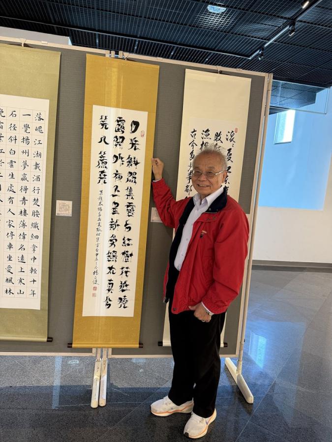 中華民國書學會甲辰年書法聯展,在台中屯區文藝中心展出,那天開幕茶會,老公興致勃勃的邀我看展,只因他也參展一幅鳥蟲書,自從他迷上了趙慕鶴大師的鳥蟲書,除了將他所寫的字寫成小論文,也開始學習他的鳥蟲體書筆法,並自運書法創作。