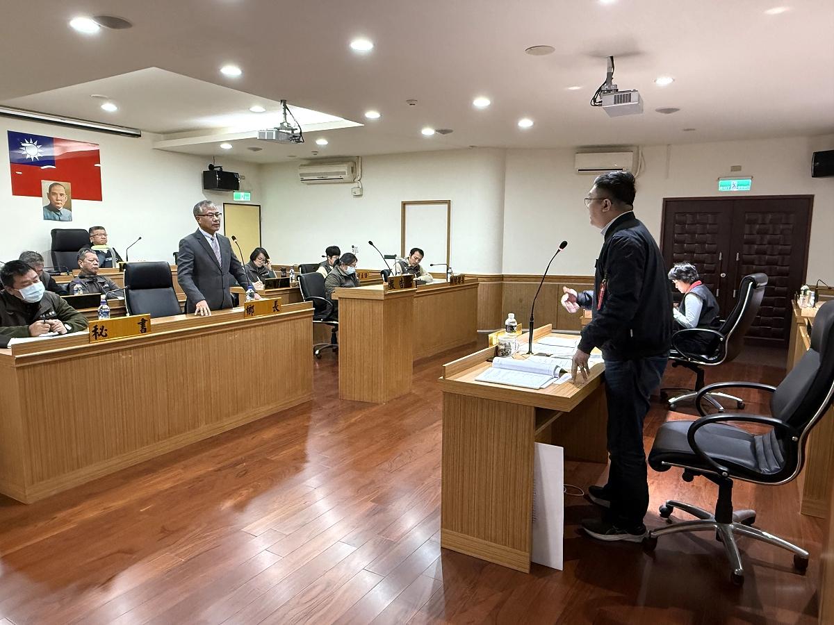 副主席陳錦泰建議,考量現址位於斜坡且前方道路狹窄,不宜設置永久性建物,主張將現正建置中的臨時停柩間移至較合適的砲台區,以兼顧行車安全與園區整體景觀;並要求公所改善停車空間不足、羽化館燈具老舊及園區廣場地坪施工品質不佳等問題。