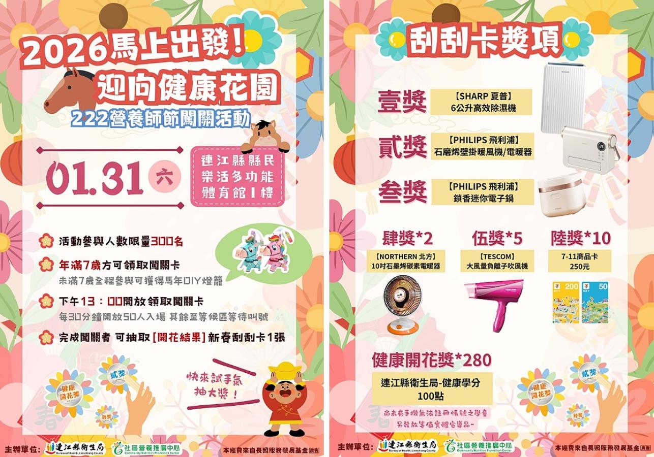 【記者王致潔報導】為推廣健康活躍老化理念,連江縣衛生局將於1月31日(六)舉辦「2026馬上出發!迎向健康花園-222營養師節闖關活動」,以多元、生活化的衛教闖關方式,帶領民眾認識正確飲食與健康新知,歡樂迎新春!