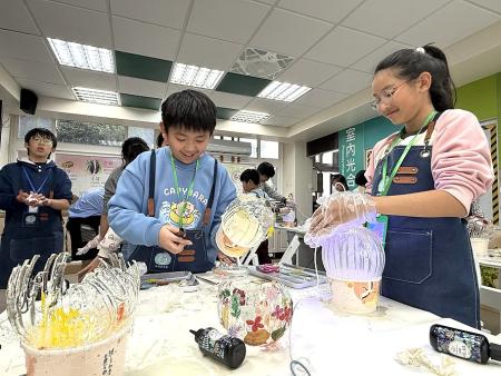 仁愛國小六年級張維琹分享,花藝製作過程相當有趣,但也考驗耐心與速度,因為完成後若未即時使用紫外線燈照射,成品就容易皺縮。符蘊尹則表示,透過一天的體驗課程,讓他更清楚認識不同行業的工作內容,對於思考未來方向相當有幫助。