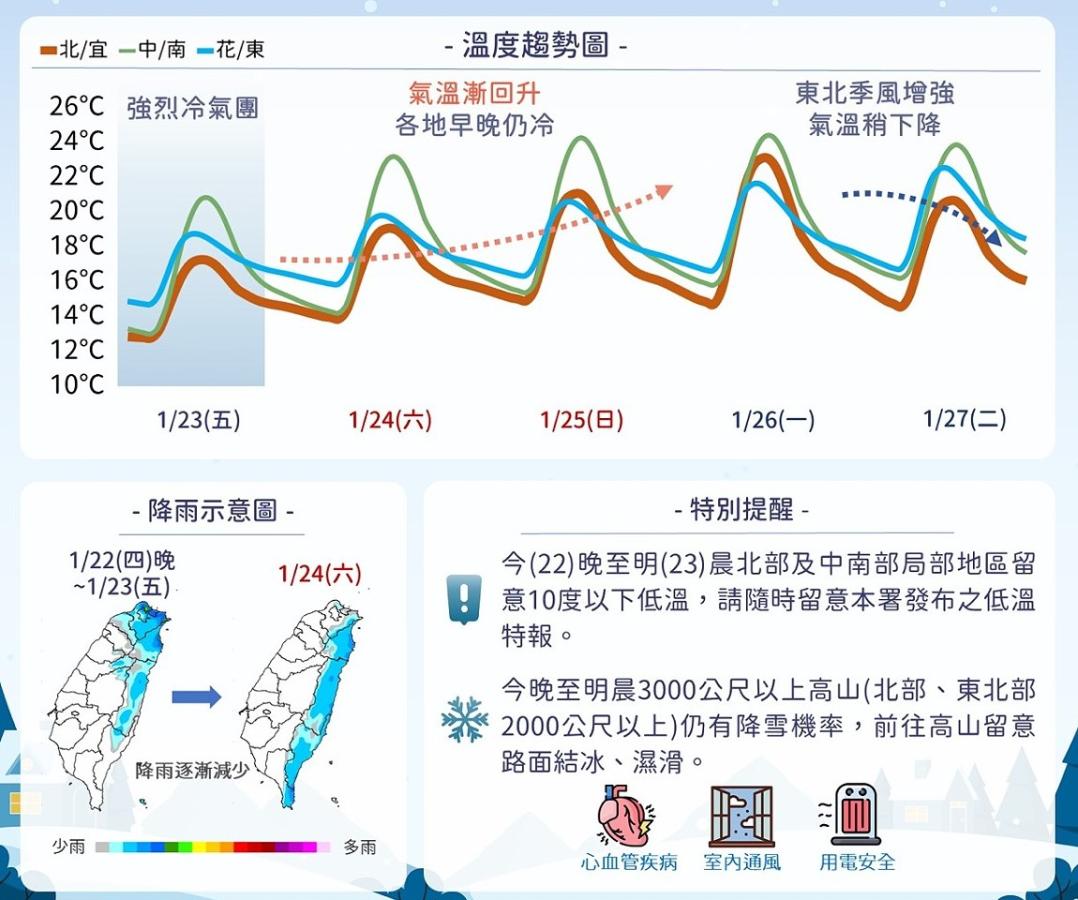 23日強烈大陸冷氣團持續影響,24日至26日冷氣團減弱,白天氣溫回升,但受輻射冷卻影響,早晚仍偏冷。(圖:中央氣象署)