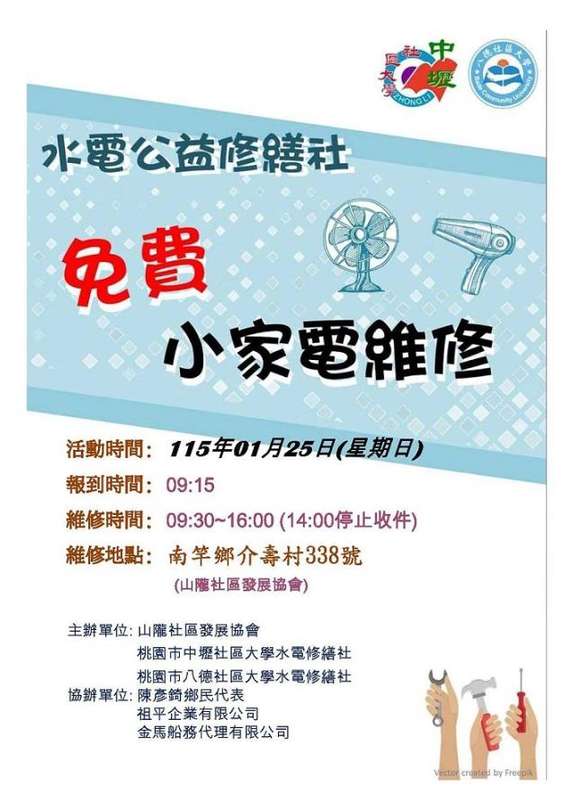 【記者王致潔報導】年終大掃除期間,家中若發現損壞卻捨不得丟棄的小家電,不妨把握難得機會送修!山隴社協攜手桃園中壢社區大學水電修繕社及八德社區大學水電修繕社,於1月25日(日)舉辦「免費小家電維修」活動,提供民眾免費檢修服務。
